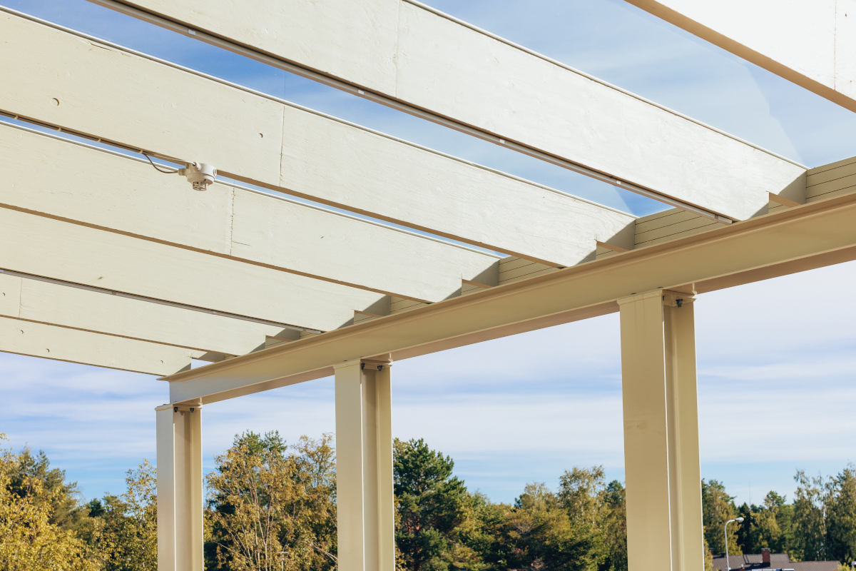 Glas som tak på terassen ger ett luftigt intryck. Till skillnad från ett plasttak håller glaset betydligt bättre för yttre påfrestningar såsom UV-strålning och temperaturväxlingar. Glasets tjocklek beräknas från glasens storlek och snölast. Glastypen är härdat glas eller laminerat+härdat glas.